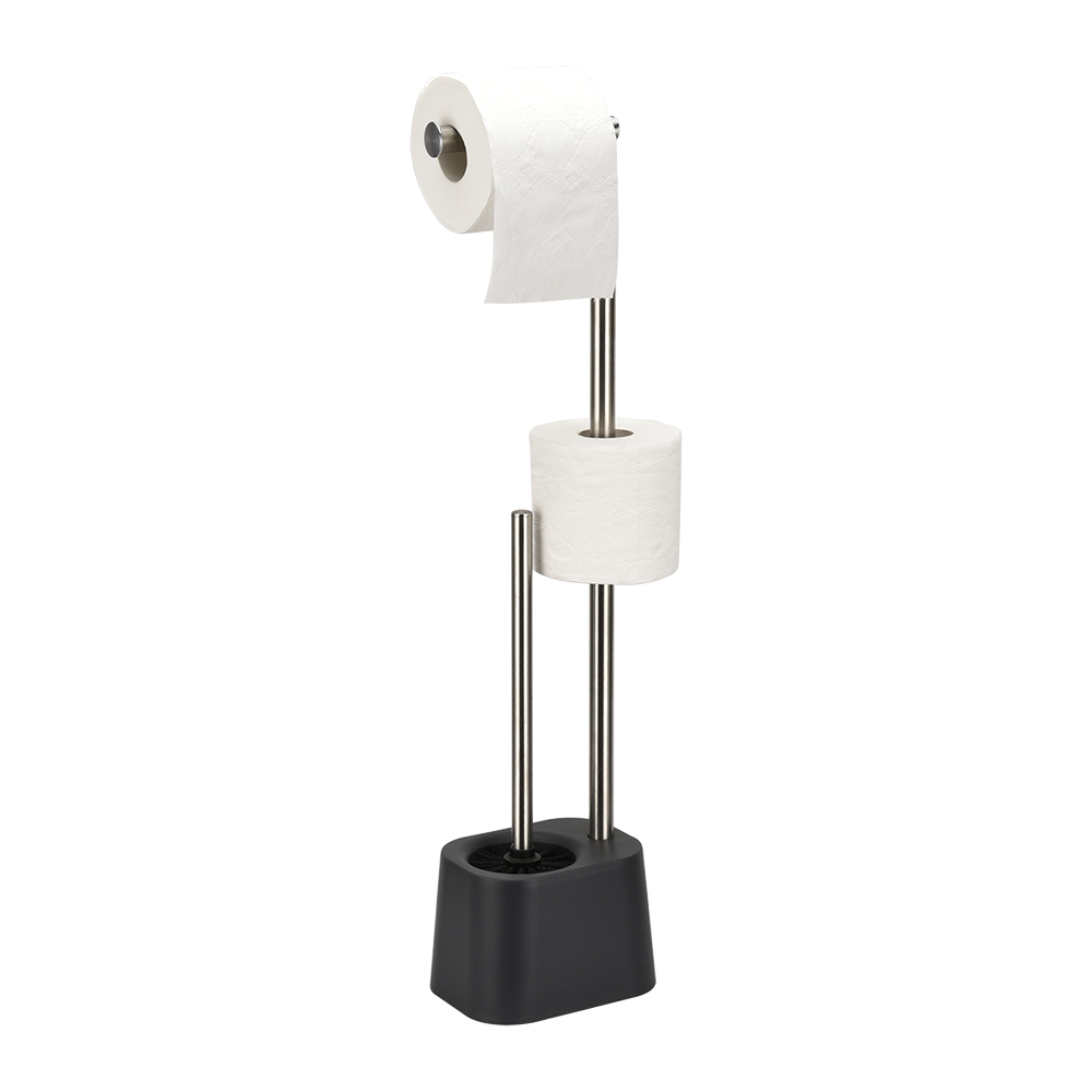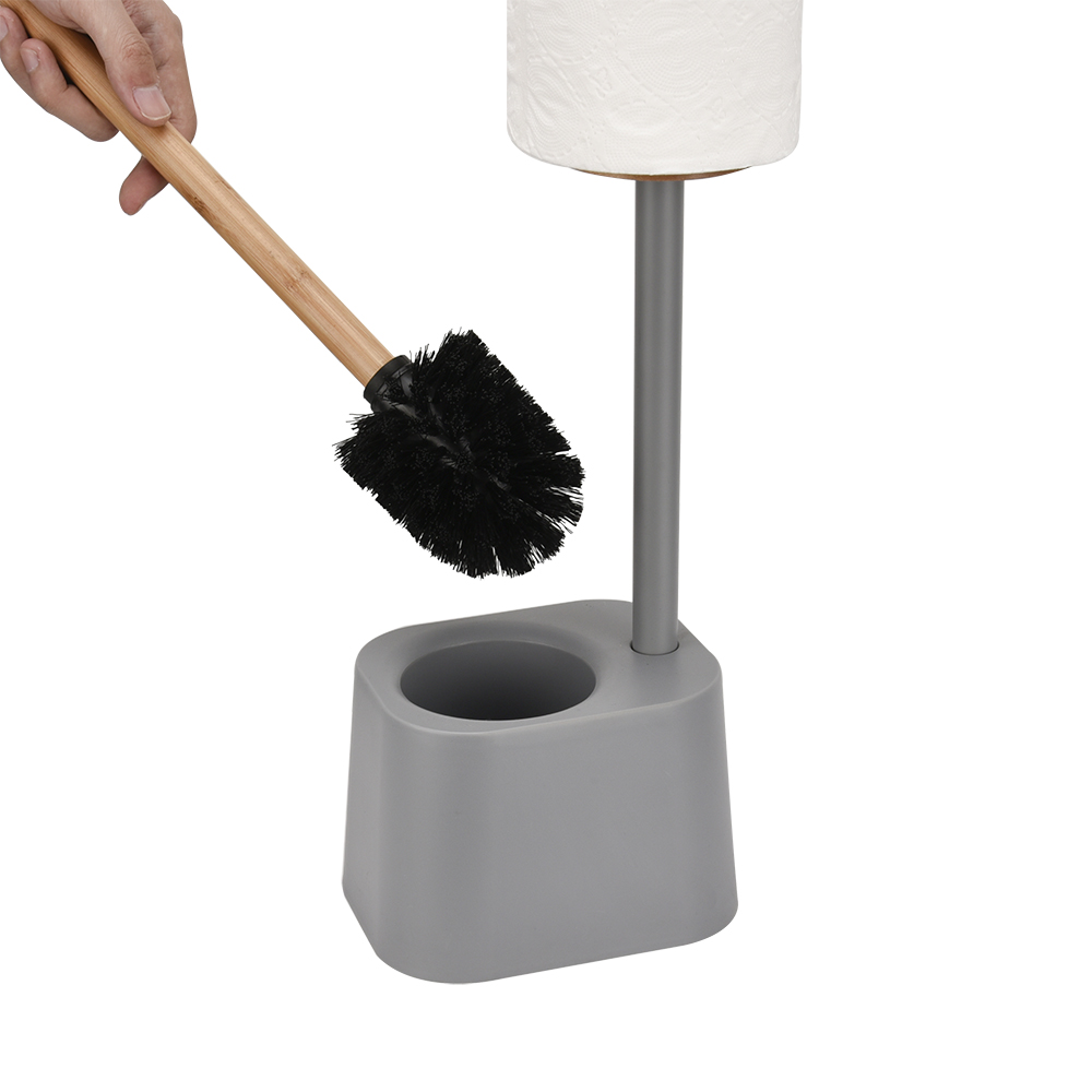 - Our toilet paper holder stand dispenses one roll and TPR silicone bristle. Of bamboo, eco-friendly material. Super easy to assemble within 3 minutes.