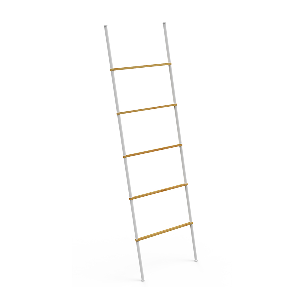 - Bathroom apartment bamboo wood ladder towel rack black white, it is just the right height for storing fresh, clean towels as your step out of the shower or tub.
