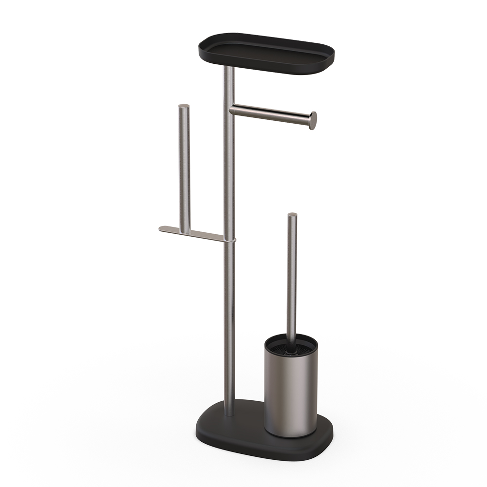 - Free standing stainless steel toilet brush and paper holder with top shelf is a space-saving design.