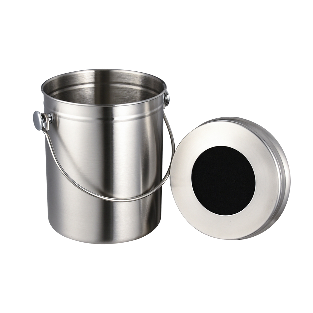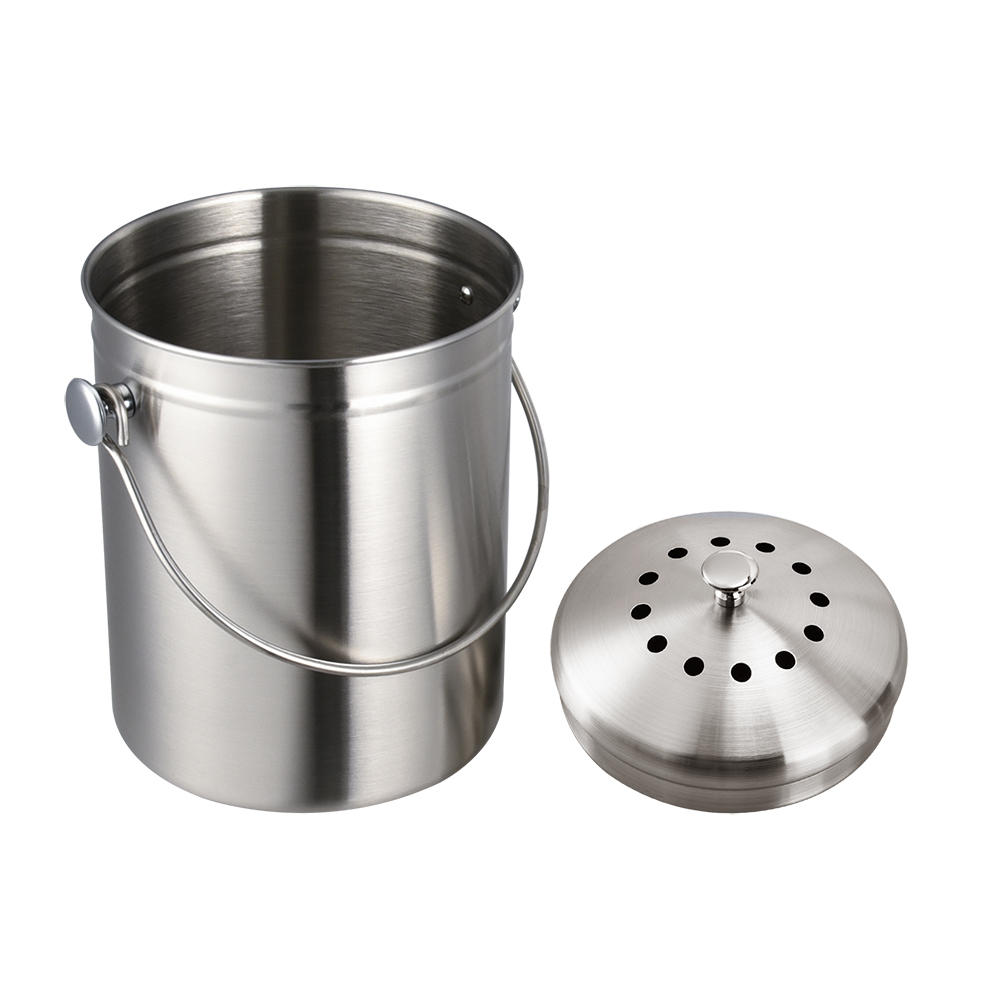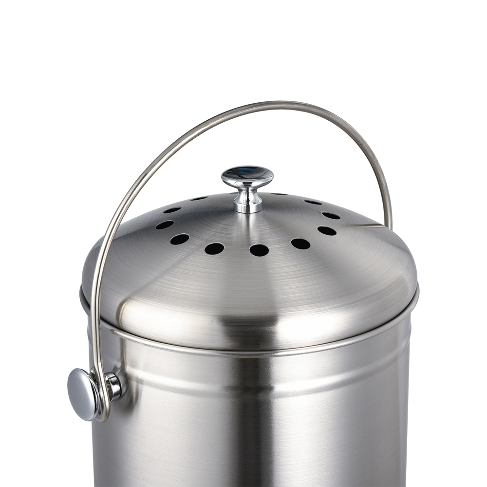 - Our Kitchen Stainless Steel Compost Bin Compost Bucket 1.3 Gallon 5 Liter with Charcoal Filters is made from strong stainless steel and the bucket is constructed out of one piece. Will not crack like a ceramic compost crock. No nasties leached into your compost. The knobs and handle are both made out of metal. Designed to last! Suitable size Dia18*28cm , makes it is enough for 2-3 days worth of scraps.