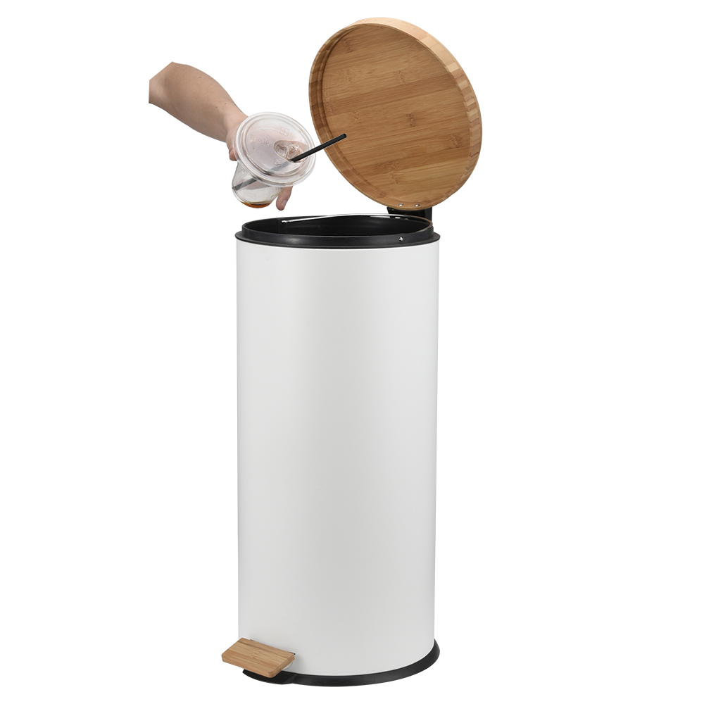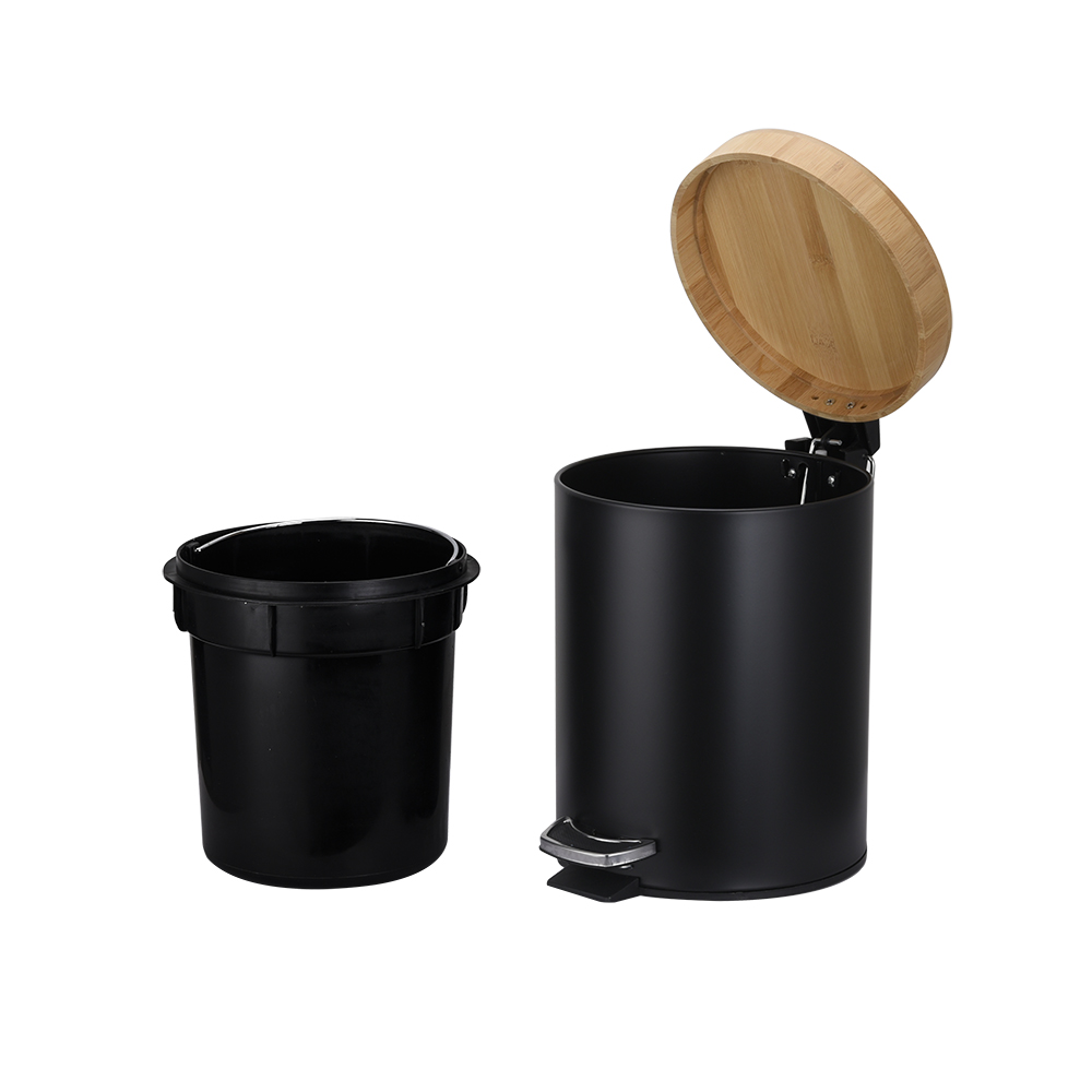 - Soft closing 5 liters 1.3 gallon steel bamboo bathroom waste bin. It is made of a stainless steel panel, sturdy.