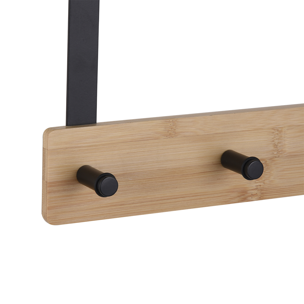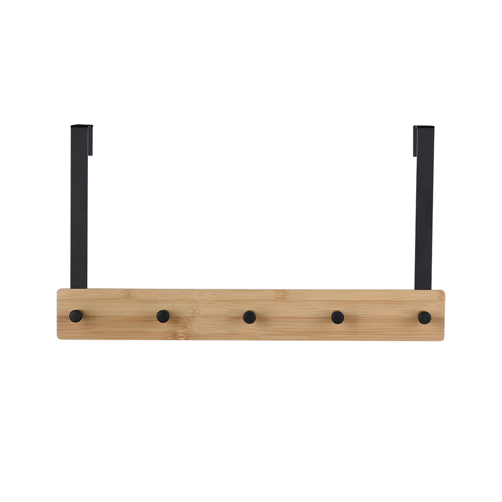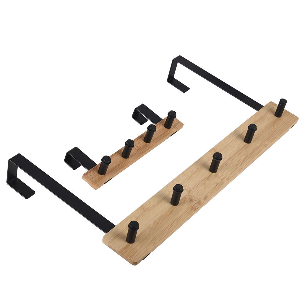 - Steel and natural bamboo over the door mounted towel rack 5 hooks black. It is of bamboo, eco-friendly material.