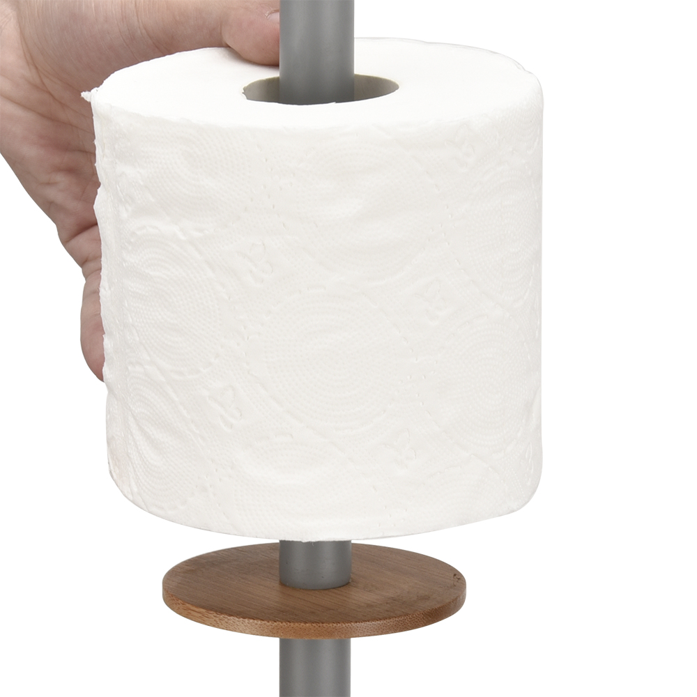 - Our toilet paper holder stand dispenses one roll and TPR silicone bristle. Of bamboo, eco-friendly material. Super easy to assemble within 3 minutes.