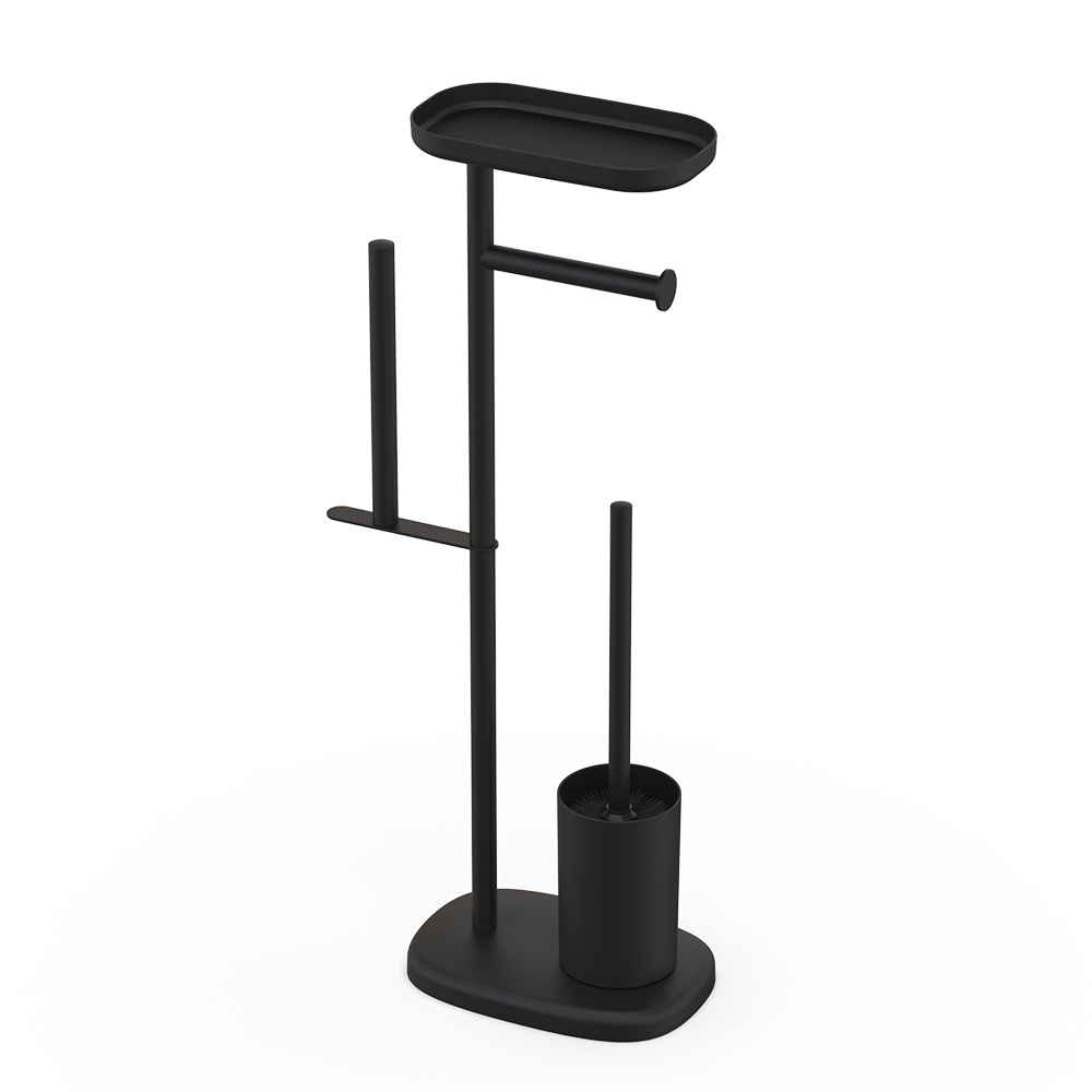- Free standing stainless steel toilet brush and paper holder with top shelf is a space-saving design.