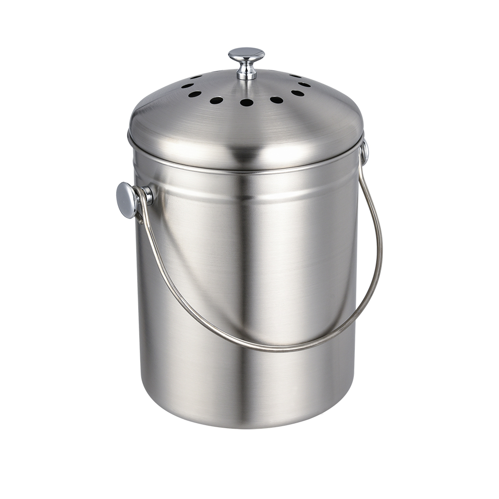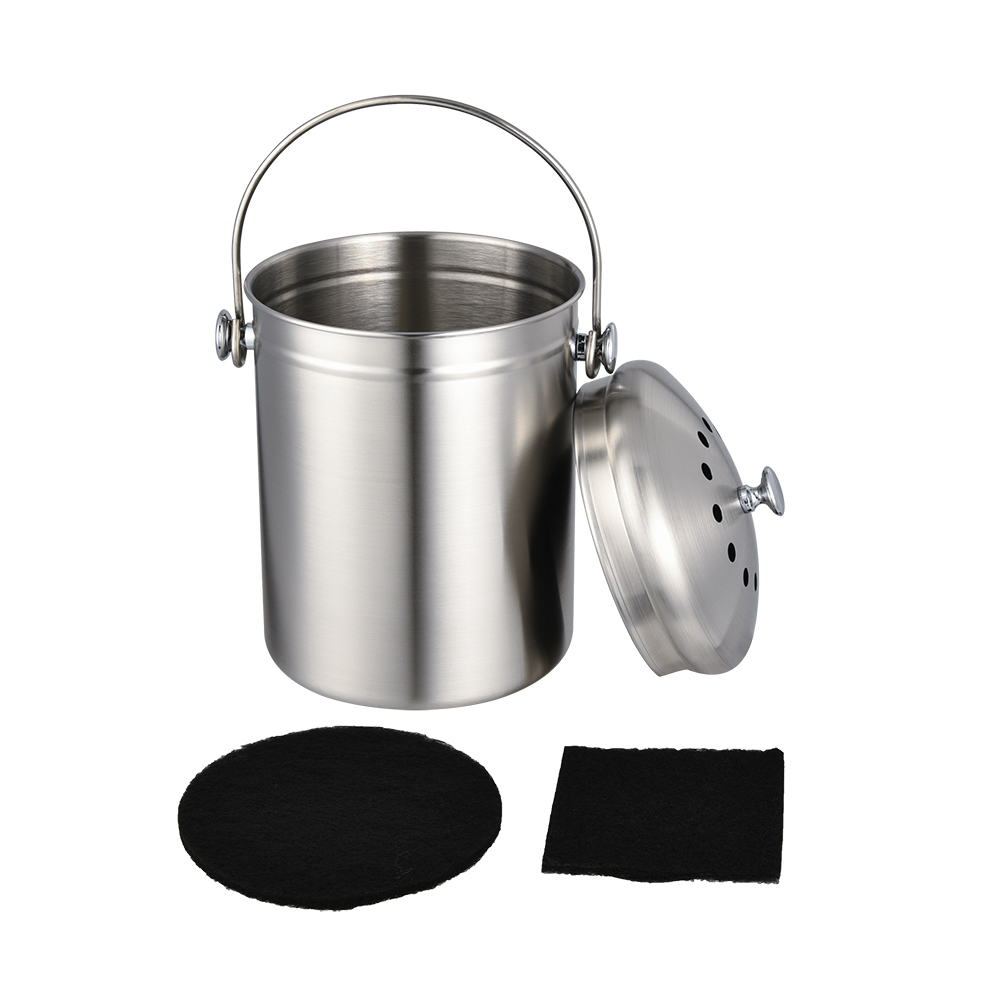 - Our Kitchen Stainless Steel Compost Bin Compost Bucket 1.3 Gallon 5 Liter with Charcoal Filters is made from strong stainless steel and the bucket is constructed out of one piece. Will not crack like a ceramic compost crock. No nasties leached into your compost. The knobs and handle are both made out of metal. Designed to last! Suitable size Dia18*28cm , makes it is enough for 2-3 days worth of scraps.