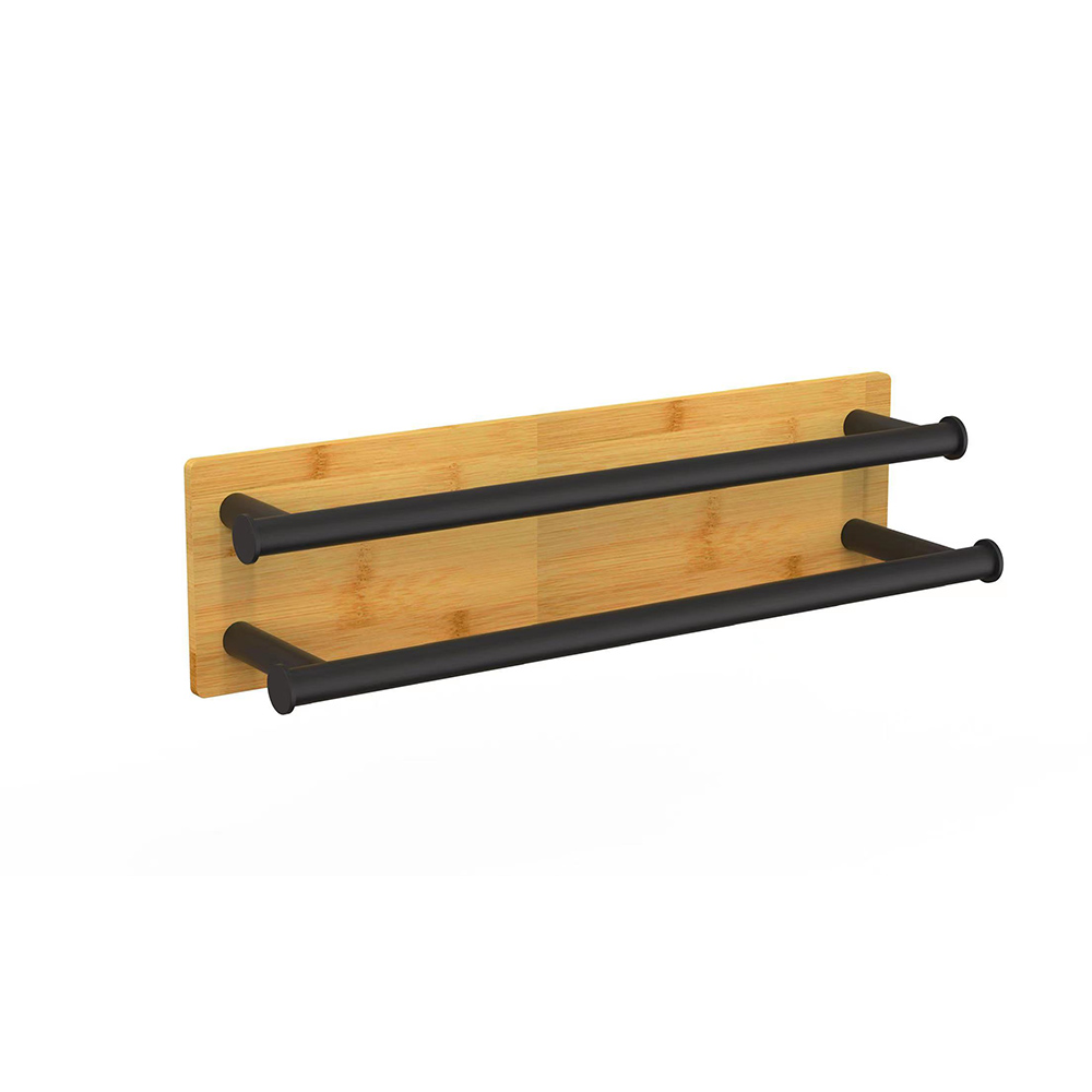 - Natural bamboo black steel self-adhesive wall bathroom towel rack, ECO-friendly material.