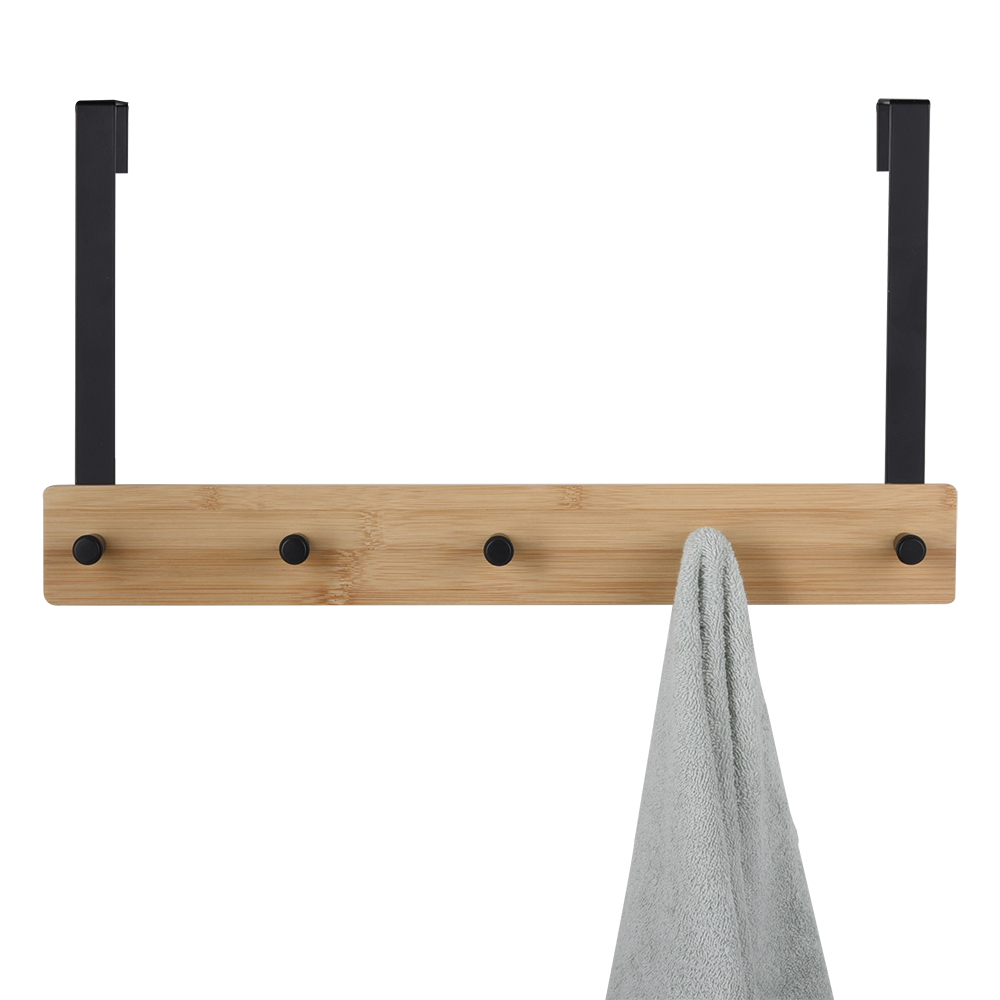Steel and natural bamboo over the door mounted towel rack 5 hooks black