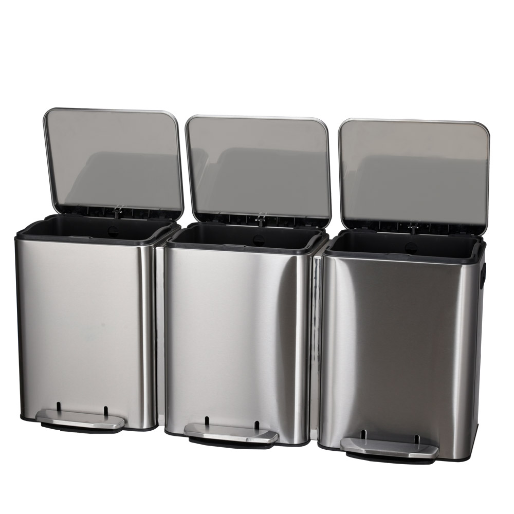 - Three compartment pedal stainless steel recycle bin is a durable cantilever foot pedal design, hands-free Operation.